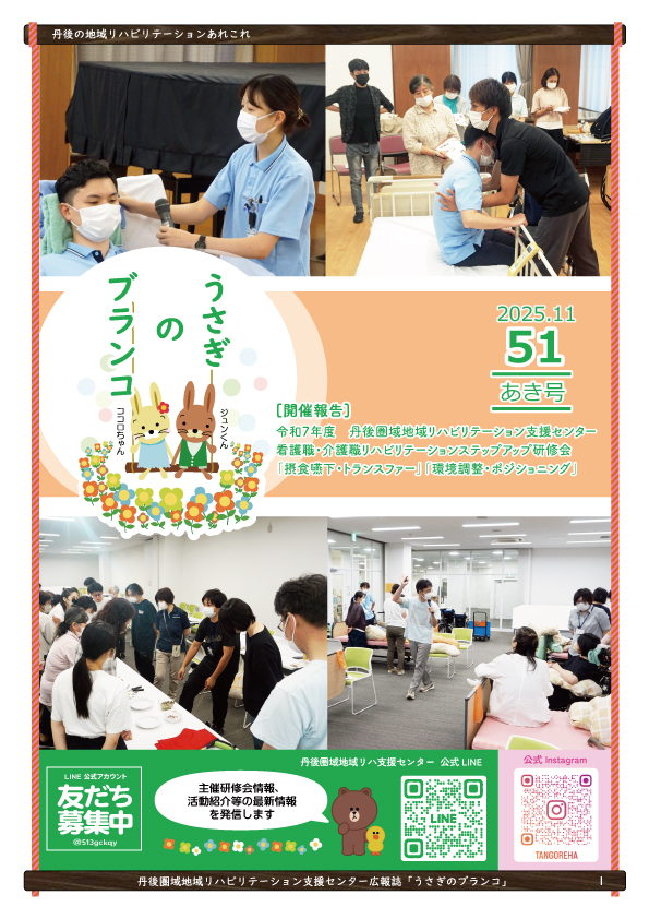 広報誌 TOP > 広報誌 丹後地域リハビリ通信「~うさぎのブランコ~」のご紹介 2025年11月 第51号(PDF) ●令和7年度 丹後圏域地域リハビリテーション支援センター 看護職・介護職リハビリテーション ステップアップ研修会 「摂食嚥下・トランスファー」 「環境調整・ポジショニング」 2025年3月 第50号(PDF) ●令和6年度 第3回事例検討会 「災害に備えたリハビリテーション専門職の対応について考える」 ●令和6年度 第4回事例検討会 「京丹後市における健康づくり・介護予防とリハビリテーション」 ●令和6年度 丹後圏域地域リハビリテーション 実践交流会 お気軽サミット ●令和6年度 地域リハビリテーション丹後圏域連絡会 2025年1月 第49号(PDF) 令和6年度第1回 事例検討会 「発達障害のあるこどものリハビリテーション支援」 令和6年第2回 事例検討会 「多職種連携で支える障害のある人の小児期~成人移行期支援」 2024年10月 第48号(PDF) ●令和6年度 看護職・介護職リハビリテーション ステップアップ研修会 「摂食嚥下・トランスファー」「環境調整・ポジショニング」 2024年3月 第47号(PDF) ●令和5年度 第3回事例検討会 「障害のあるこどもに関わる支援者とリハビリテーション専門職のネットワーク」 ●令和5年度 第4回 事例検討会 「京丹後市における健康づくり・介護予防とリハビリテーション」 ●令和5年度丹後圏域地域リハビリテーション実践交流会お気軽サミット 2024年1月 第46号(PDF) ●令和5年度 京都府立与謝の海支援学校 医療専門職派遣事業学習会 ●令和5年度 第2回 事例検討会 2023年11月 第45号(PDF) ●令和5年度 第1回 事例検討会 ●令和5年度 看護職・介護職リハビリテーション ステップアップ研修会 2023年3月 第44号(PDF) ●令和4年度 第3回 事例検討会 ●令和4年度 丹後圏域地域リハビリテーション実践交流会 お気軽サミット ●令和4年度 第4回 事例検討会 2023年1月 第43号(PDF) ●開催報告 ●令和4年度看護職・介護職リハビリテーションステップアップ研修会 ●令和4年度 第2回事例検討会 2022年11月 第42号(PDF) ●開催報告 ●令和4年度第1回 事例検討会 ●令和4年度医療職派遣事業学習会 2022年3月 第41号(PDF) ●開催報告 ●令和3年度 第3回事例検討会 ●令和3年度第4回事例検討会 ●令和3年度丹後圏域地域リハビリ 実践交流会 お気軽サミット 2022年1月 第40号(PDF) ●開催報告 ●看護職・介護職リハビリテーションステップアップ研修会 ●令和3年度 第2回事例検討会 バックナンバー Vol.1~Vol.10 vol.11~vol.20 vol.21~vol.30 vol.31~vol.40